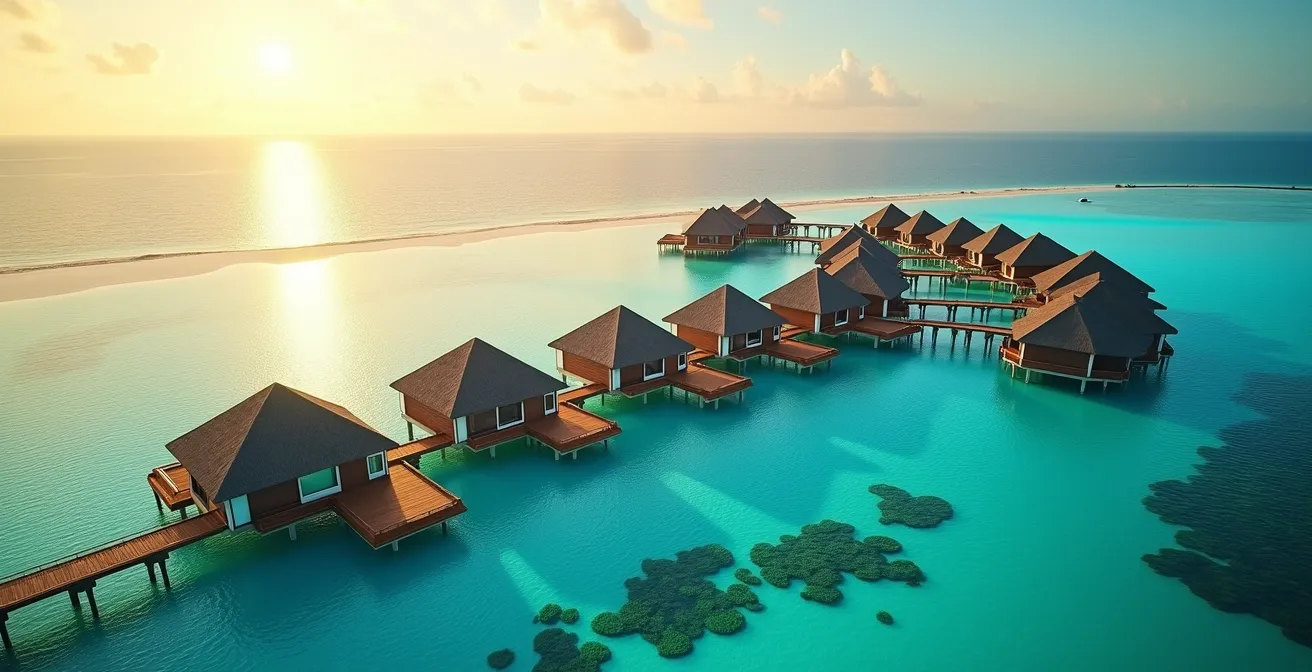 El principal factor que infla el precio de un bungalow sobre el agua no es el lujo tangible, sino el valor percibido. La exclusividad de «dormir sobre el mar» es un poderoso argumento de marketing. Sin embargo, es crucial analizarlo fríamente. Diversos análisis de precios confirman que, en un mismo resort, el coste de los bungalows sobre el agua es un 40% más alto que el de las villas en la playa, a menudo con un tamaño y unas comodidades interiores idénticas. Este sobreprecio se justifica casi exclusivamente por la estructura de pilotes y el acceso directo a la laguna. No paga por una cama más cómoda, un mejor servicio o una gastronomía superior; paga por una ubicación icónica.